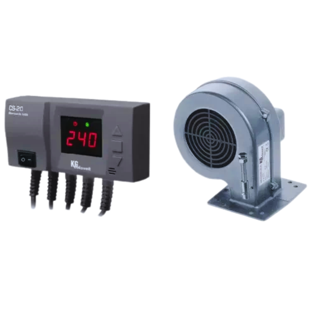 Контролер KG Elektronik CS-20 управляє вентилятором наддуву і насосом центрального опалення (ЦО), адаптуючись до типу твердопаливного котла та палива. Доступні режими: