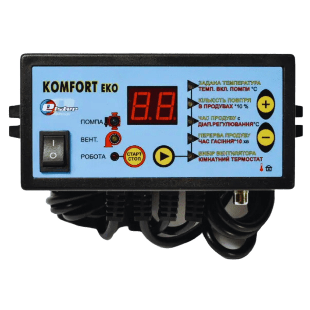 Автоматика керує насосом центрального опалення та вентилятором. В комплект входять всі потрібні датчики та кабелі для підключення.