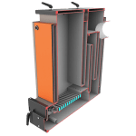 Конвекційна частина котла є триходовим теплообмінником, що складається з двох плит і знаходиться він безпосередньо за топковою камерою. Корпус котла має форму паралелепіпеда з подвійними стінками, які розділені між собою водяними перегородками. Зовнішній корпус котла теплоізольований шаром теплоізоляційного матеріалу, що дозволяє зберігати температуру всередині котла і підвищує рівень ККД.