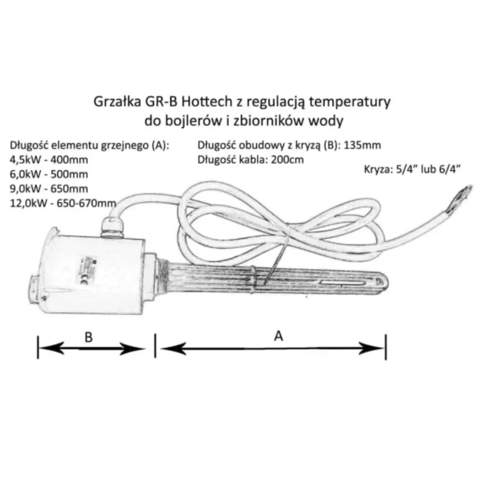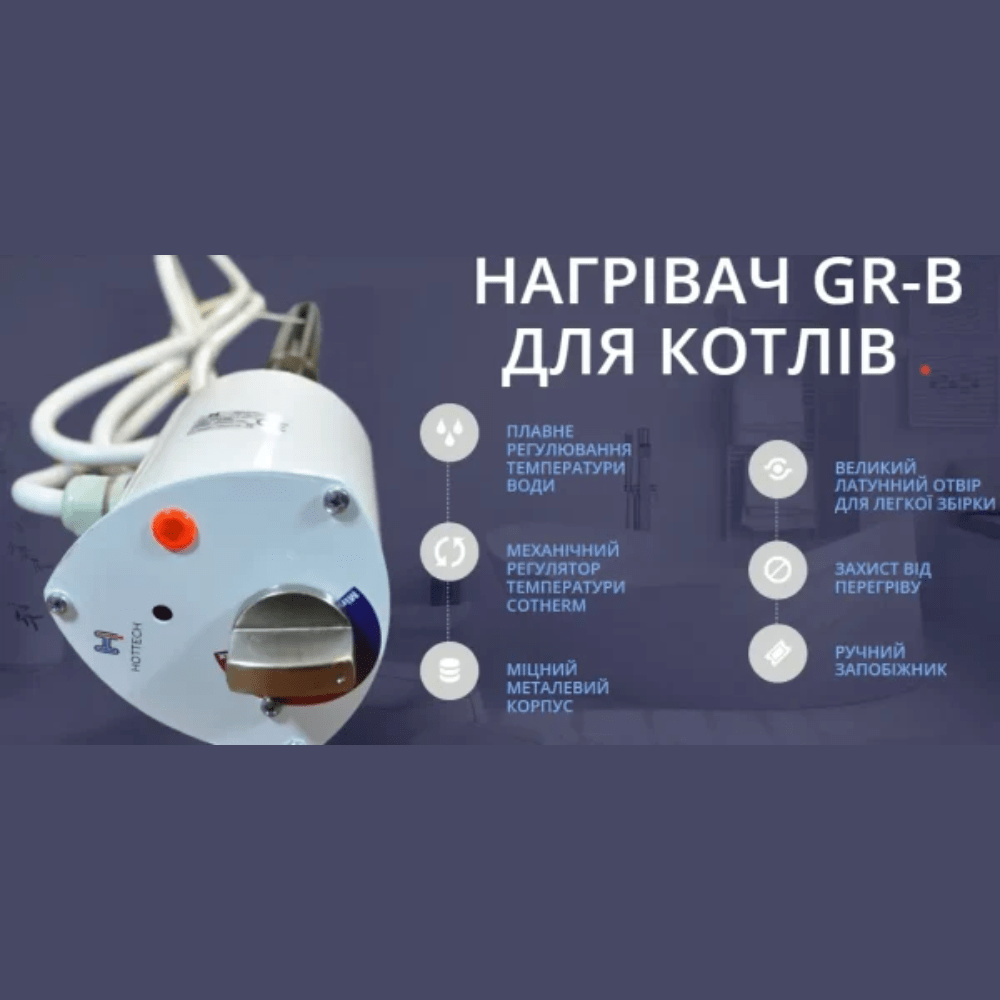 Електронагрівач GR-B – модель високої потужності з регулюванням температури, призначена для котлів і водонагрівачів великої потужності , в тому числі й тих, що працюють в геліосистемах.